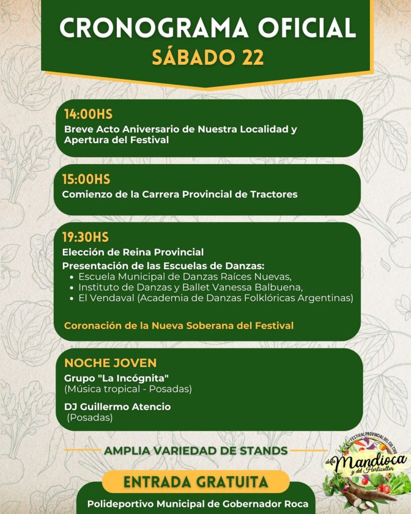 La localidad de Gobernador Roca vivirá este fin de semana una nueva edición de la Fiesta Provincial del Cultivo de la Mandioca y del Horticultor, un evento que combina tradición, gastronomía y competencia, y que año a año atrae a visitantes de toda la provincia. Las actividades se desarrollarán el sábado 22 y domingo 23 en el Polideportivo Municipal, con entrada totalmente gratuita.