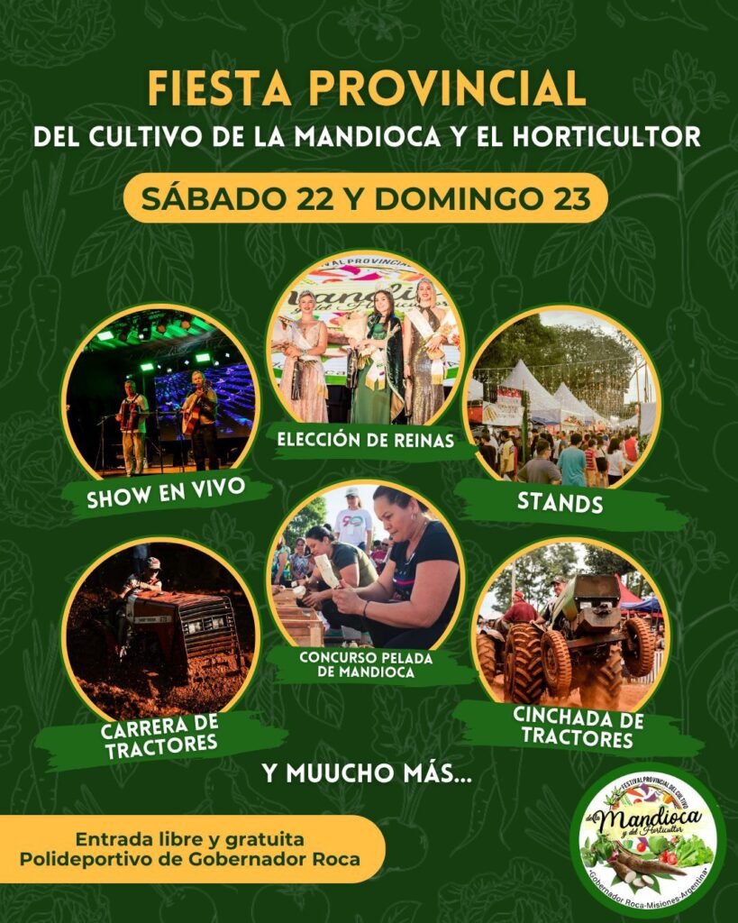 La 25ª edición de la Fiesta de la Mandioca y la 9ª Fiesta del Horticultor se realizarán este sábado 22 y domingo 23 en Gobernador Roca, con entrada libre y gratuita, múltiples competencias, espectáculos musicales y una variada propuesta gastronómica que destaca los productos locales.