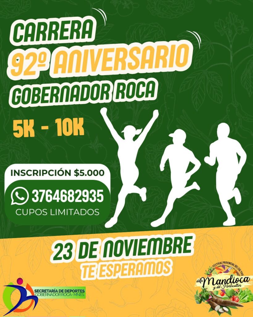 El domingo por la mañana se añadirá una novedad: una maratón tipo trail que recorrerá los caminos terrados del municipio. La competencia se integra al triple festejo que vive la localidad: la 25ª edición del festival de la mandioca, la 9ª del horticultor y el 92° aniversario de Gobernador Roca. “Es un combo que celebramos con mucho orgullo”, remarcó Lukowski.