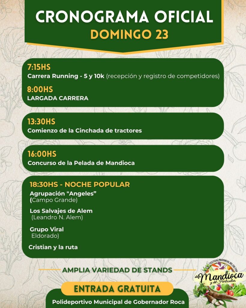 El cronograma contempla actividades desde temprano, con la carrera running de 5K y 10K a las 7:15, la largada a las 8:00, la cinchada de tractores a las 13:30 y el concurso de pelada de mandioca a las 16:00. La noche popular iniciará a las 18:30 con la presentación de varias agrupaciones musicales.