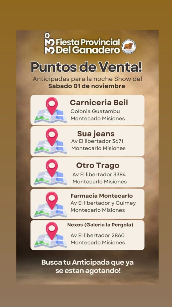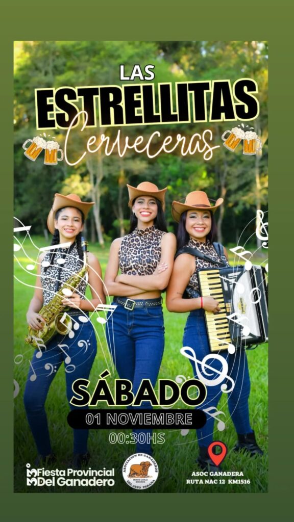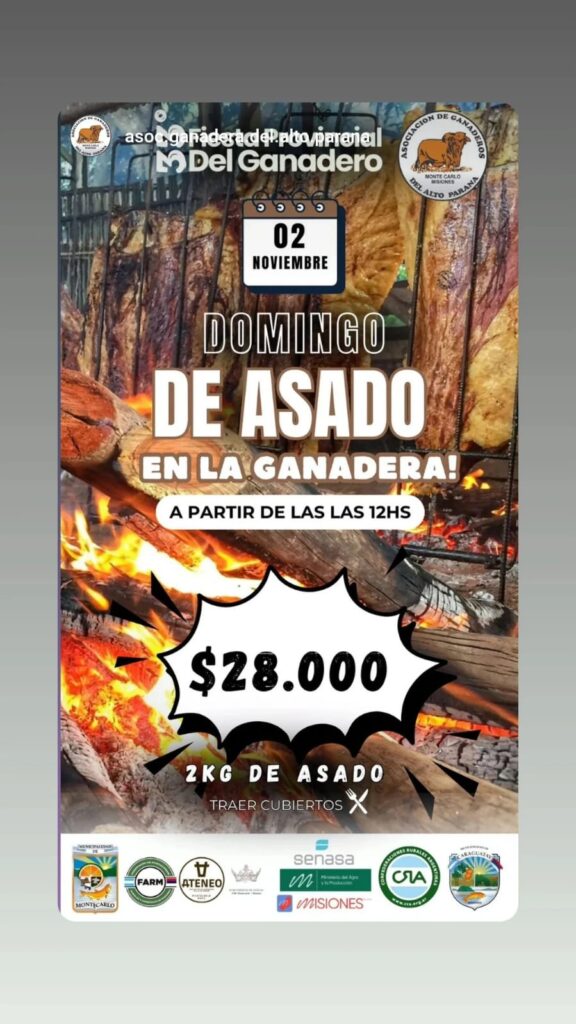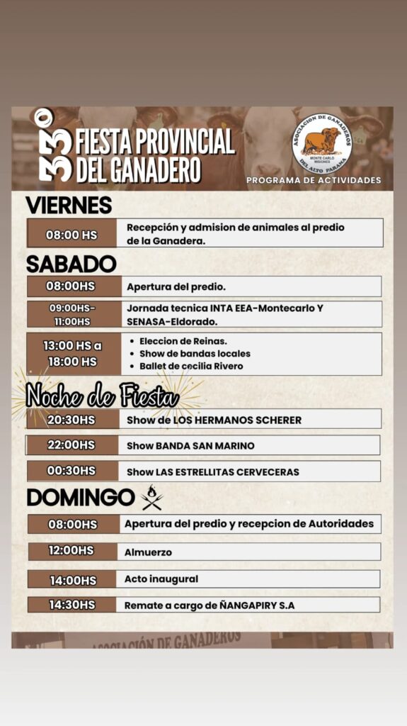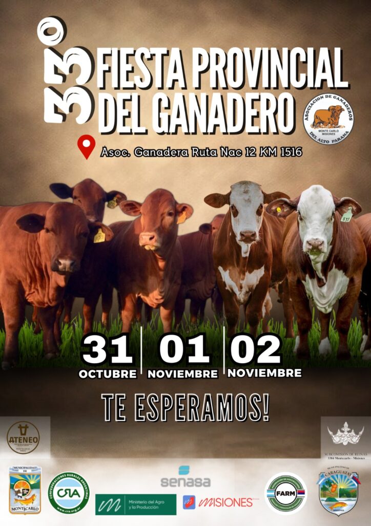 La Asociación Ganadera de Montecarlo realizará del 31 de octubre al 2 de noviembre la 33ª edición de la Fiesta Provincial del Ganadero. Habrá jornadas técnicas, remate con más de 500 cabezas, 400 kilos de asado y espectáculos artísticos. La entrada al predio será gratuita.